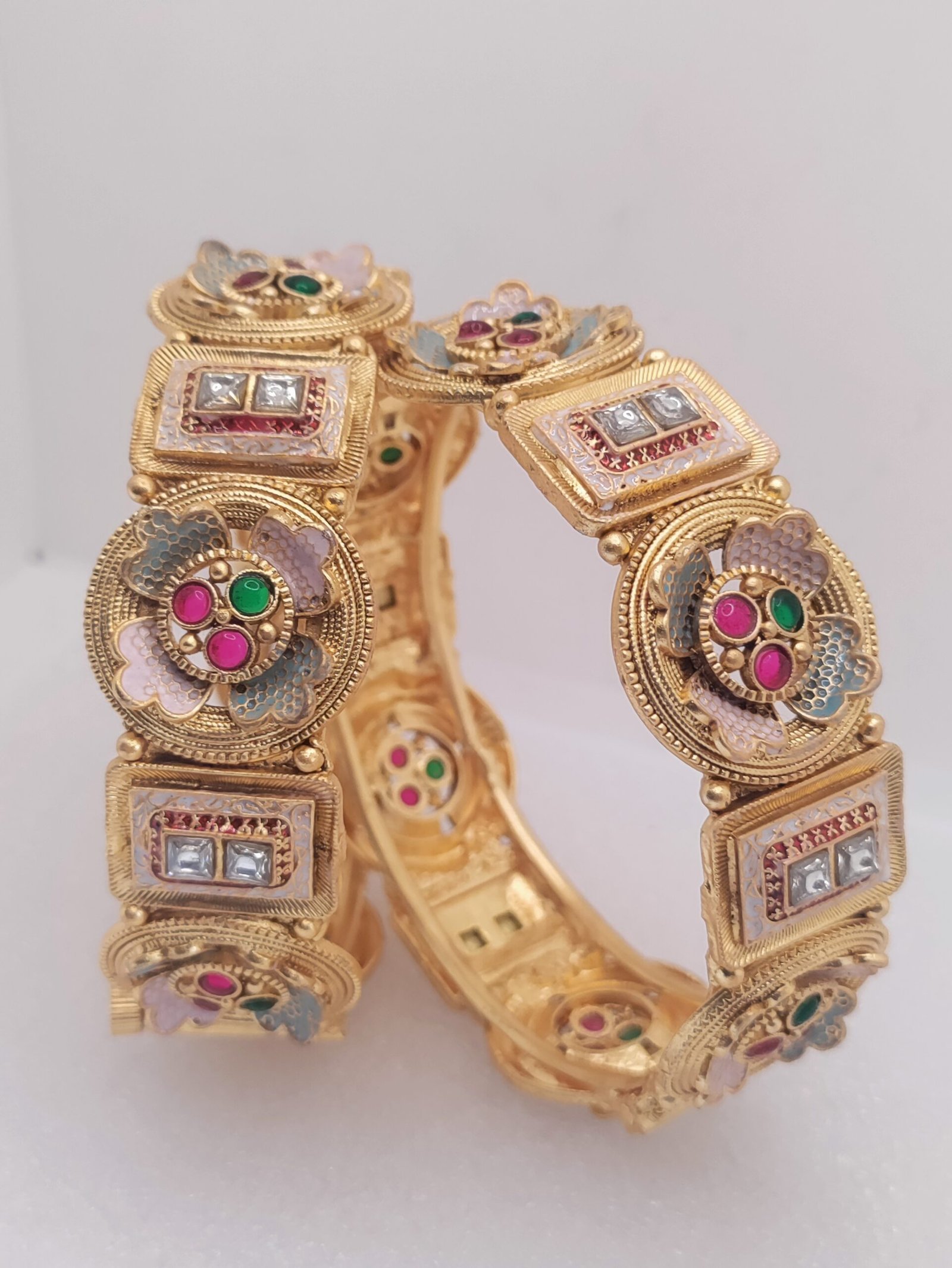 pair of traditional gold bangles, intricately designed with a combination of textures and embellishments. Each bangle features multiple square and circular sections, adorned with sparkling stones, colorful gem insets, and detailed metalwork that showcases skilled artistry. The use of vibrant colors against the gold creates a striking contrast, making these bangles not only accessories but also pieces of cultural expression. Their elaborate design reflects a rich heritage and would be an interesting addition to any collection or attire that values traditional craftsmanship.