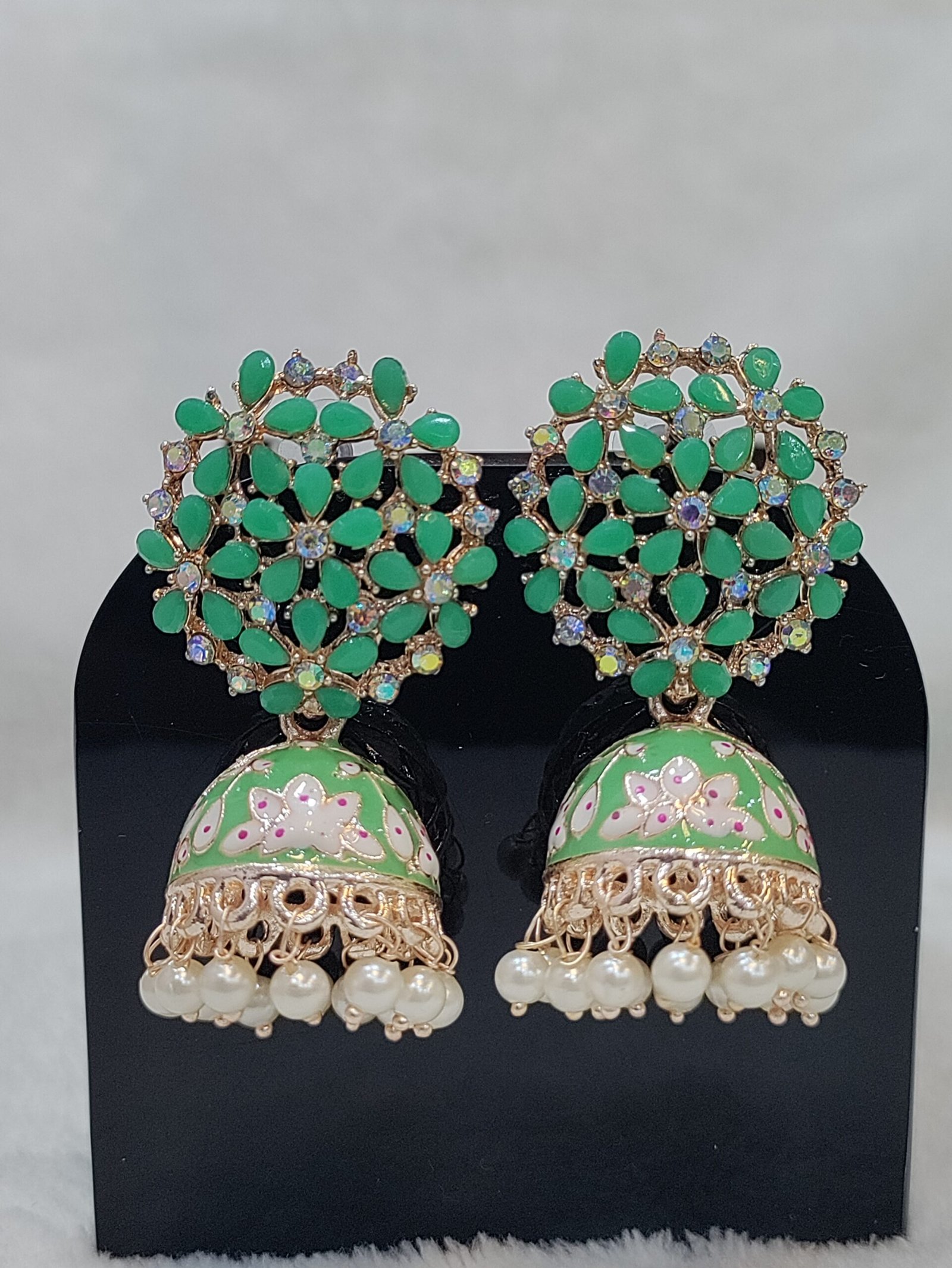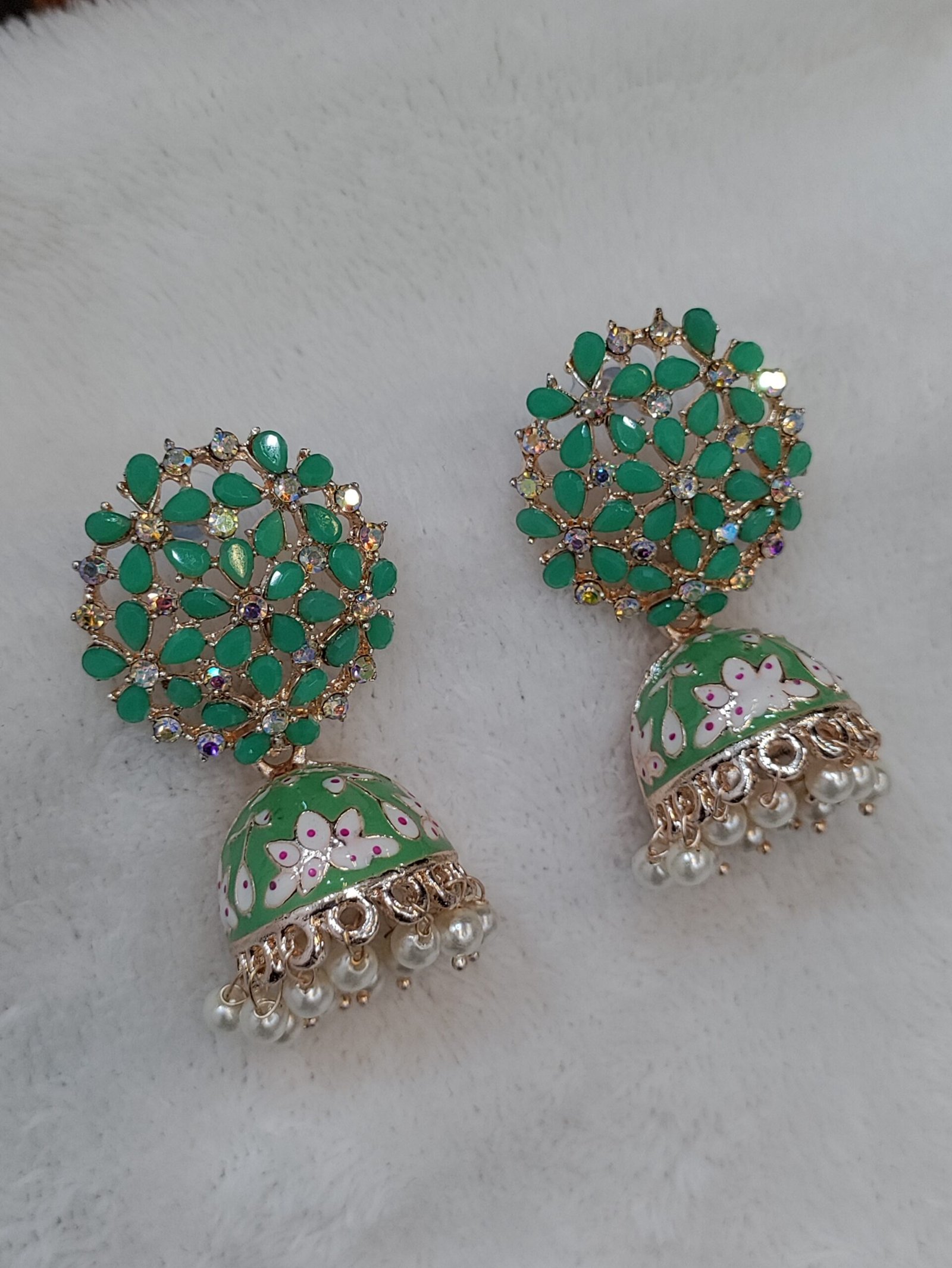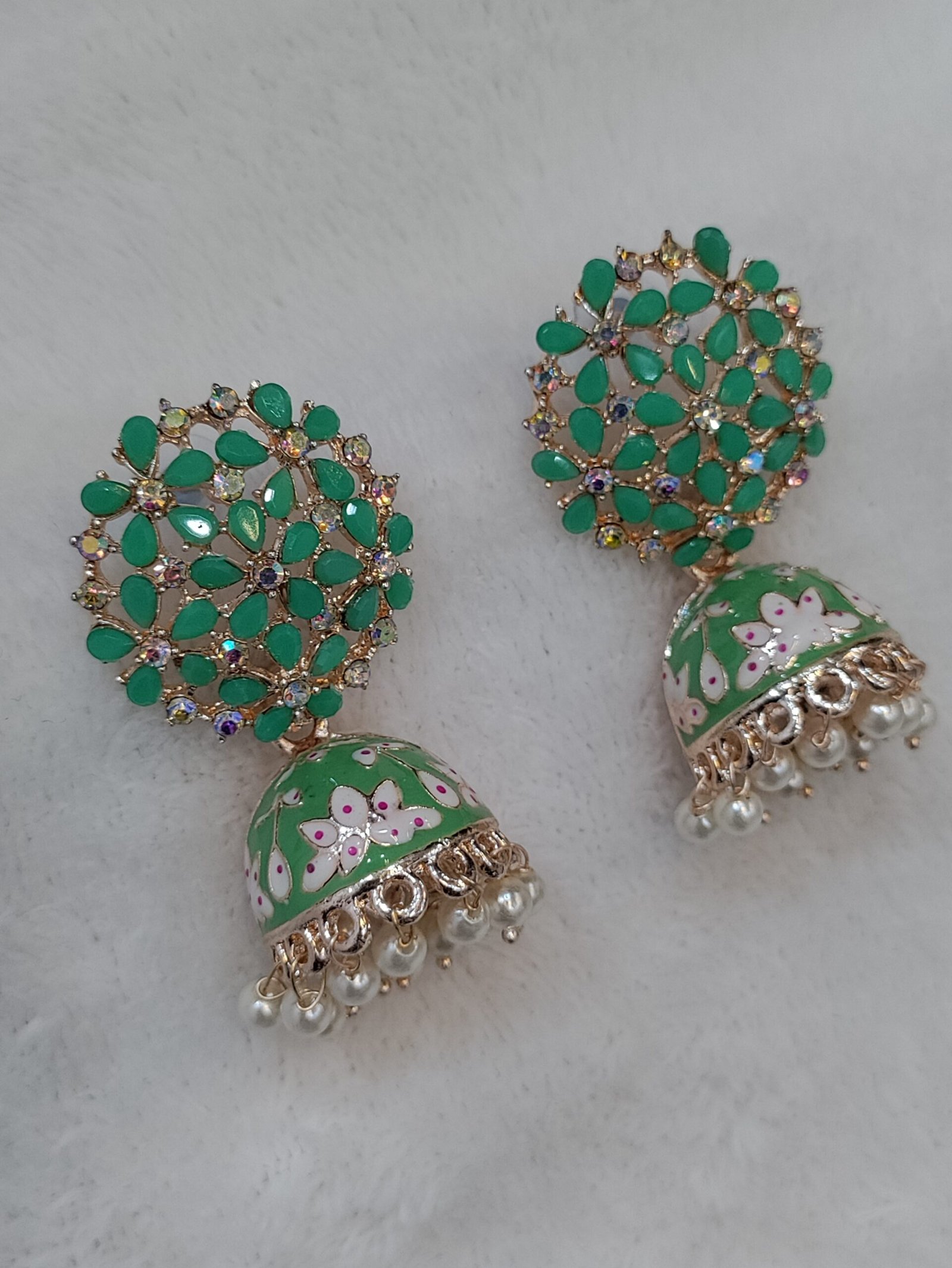 Traditional Gold Plated Pastel Green Jhumki Earring with Bogenvilla of Cystals
