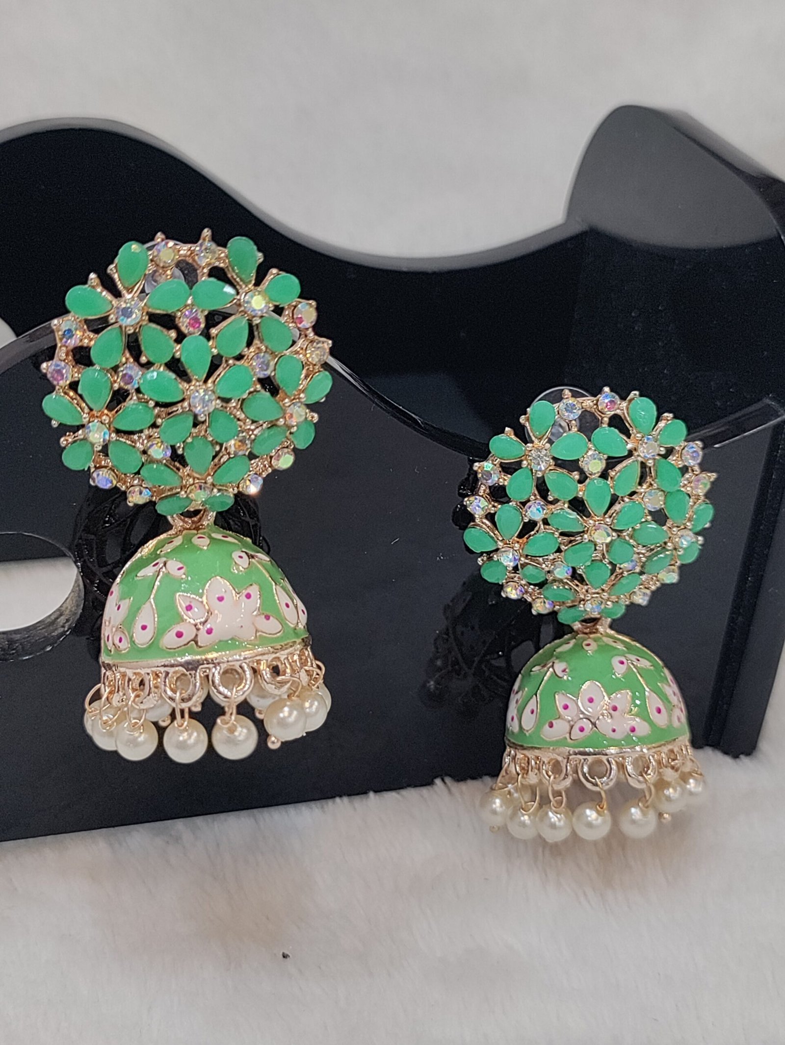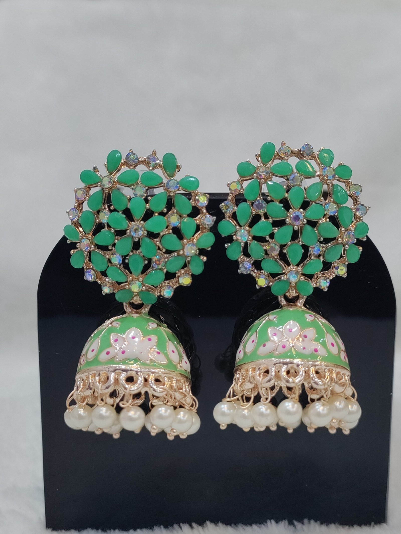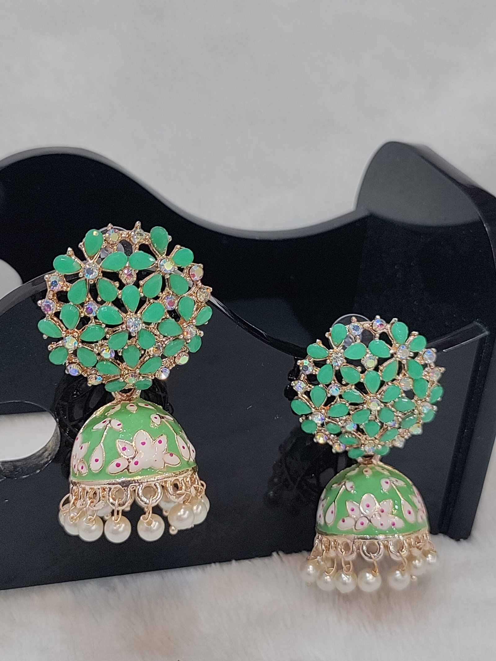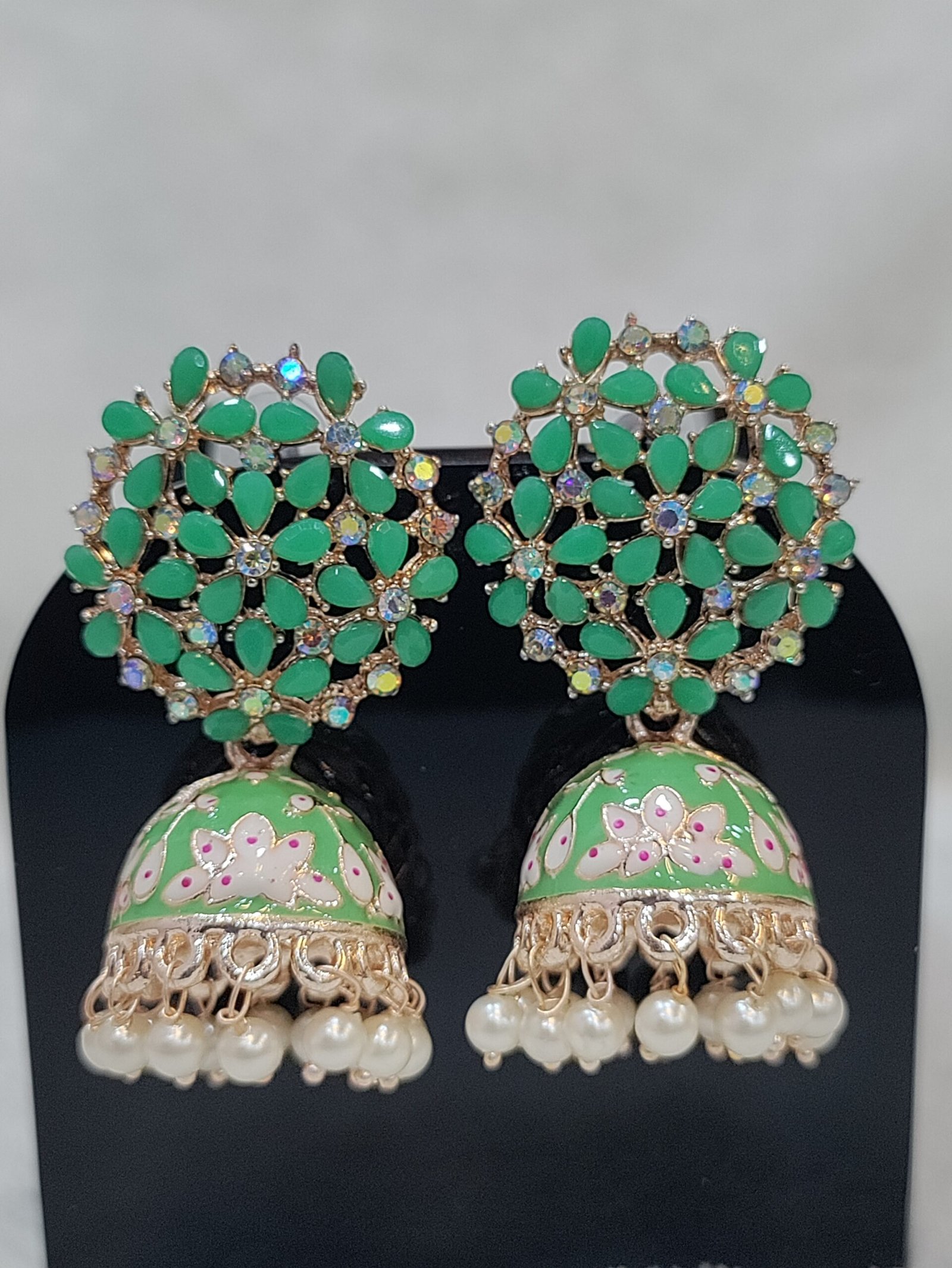 Traditional Gold Plated Pastel Green Jhumki Earring with Bogenvilla of Cystals
