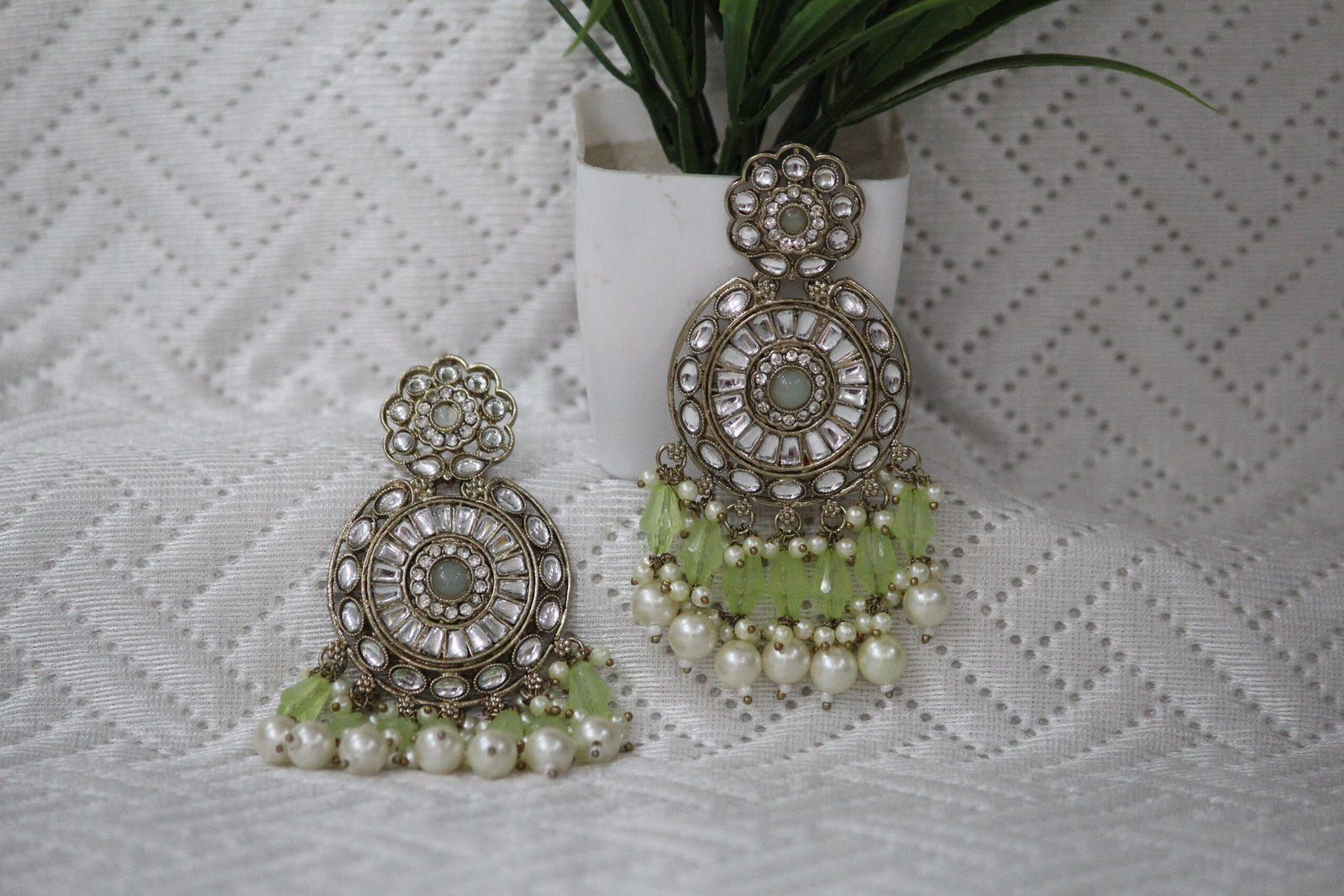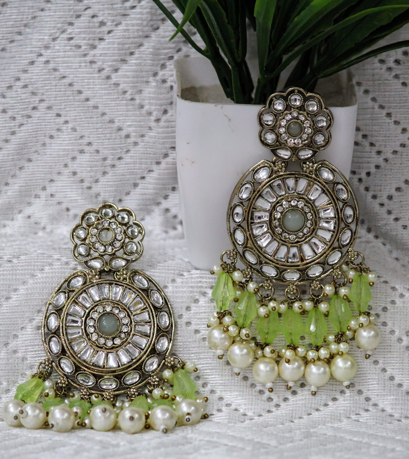 Traditional Heavy Kundan Earrings/Chandbali with Pastle Green Drops and white Pearls to add Elegance