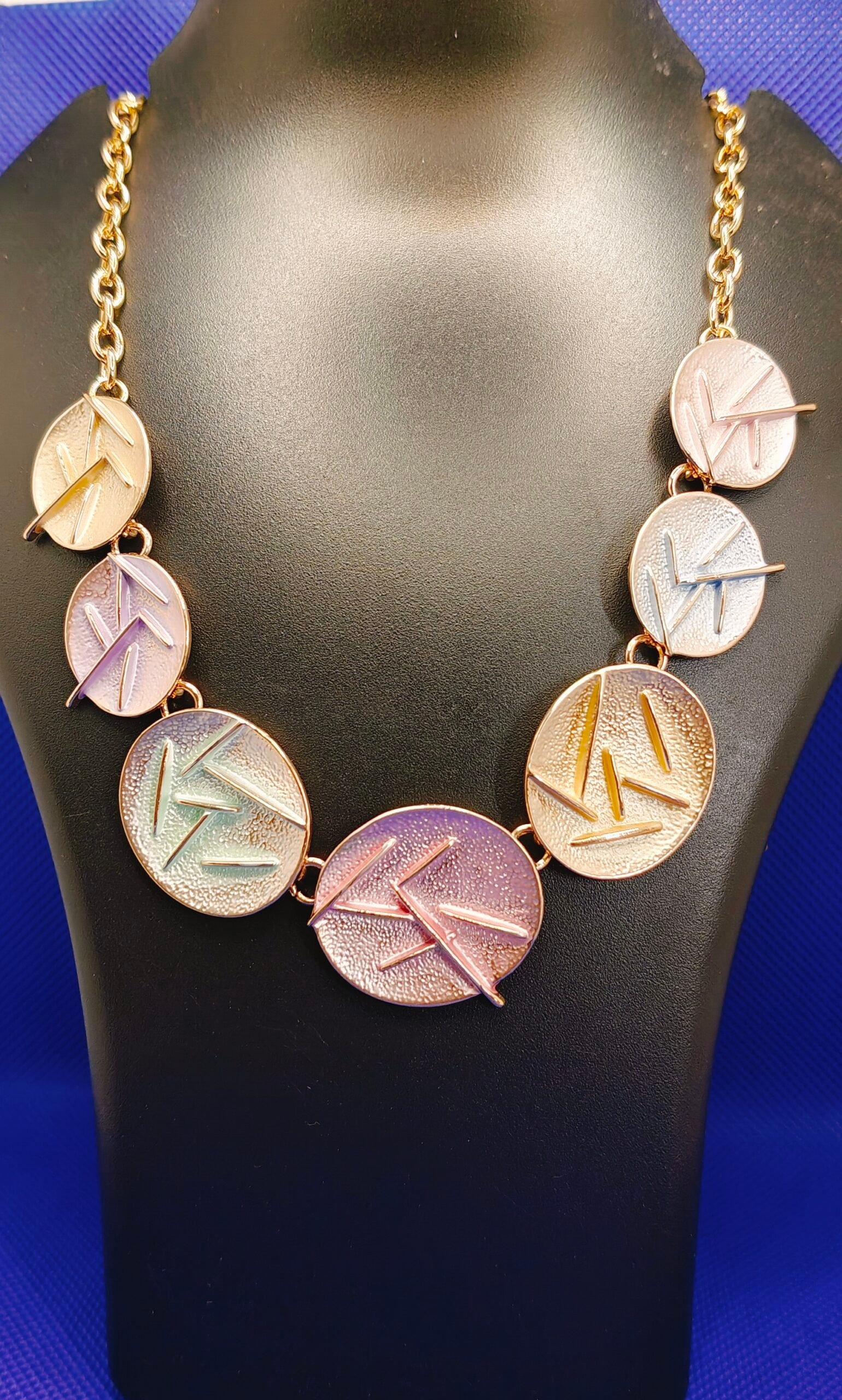 Make a contemporary statement with this unique necklace featuring multiple oval discs in a mix of metallic finishes and subtle colors. Each disc boasts an intriguing etched design. Perfect for adding an artistic touch to any outfit.