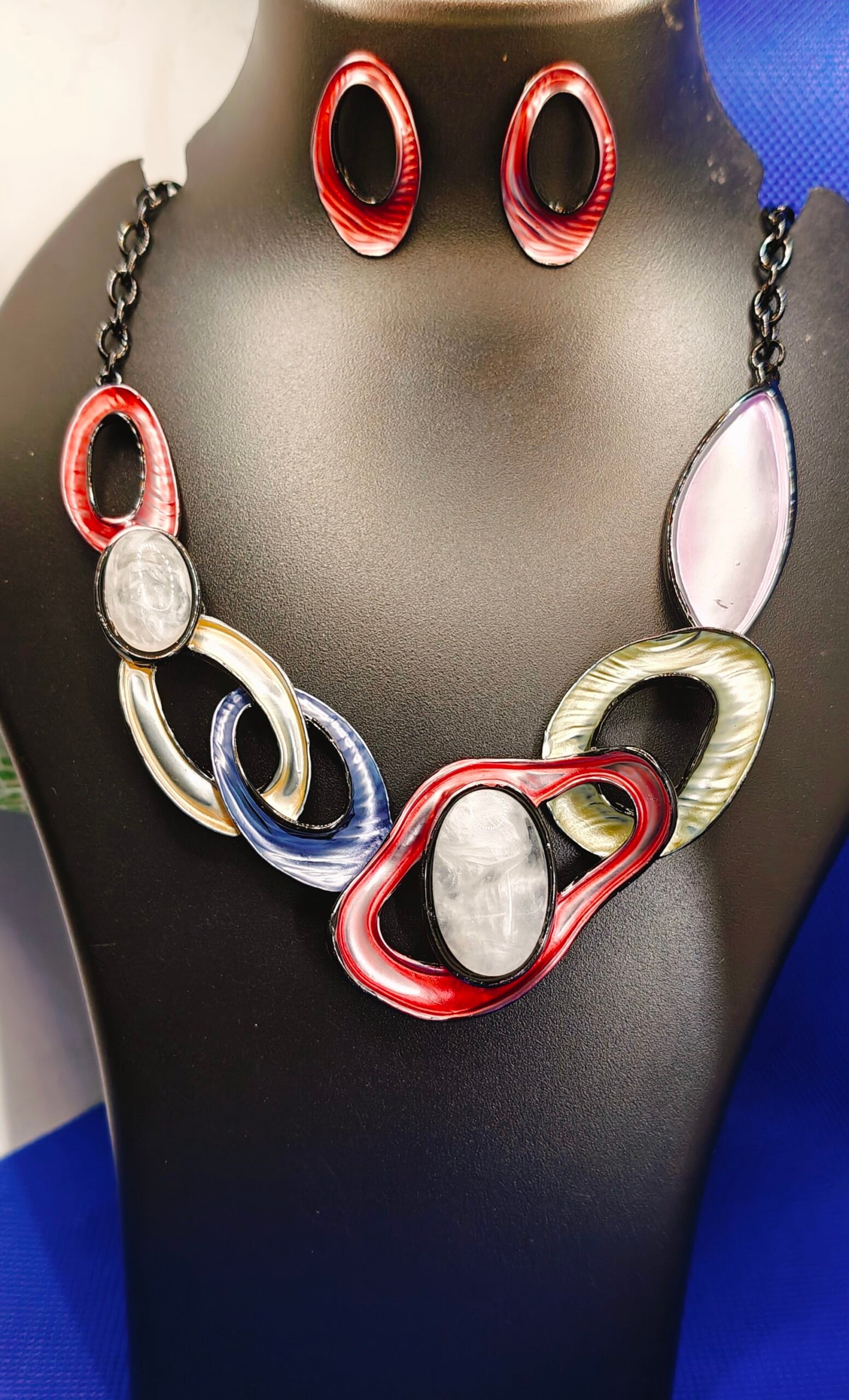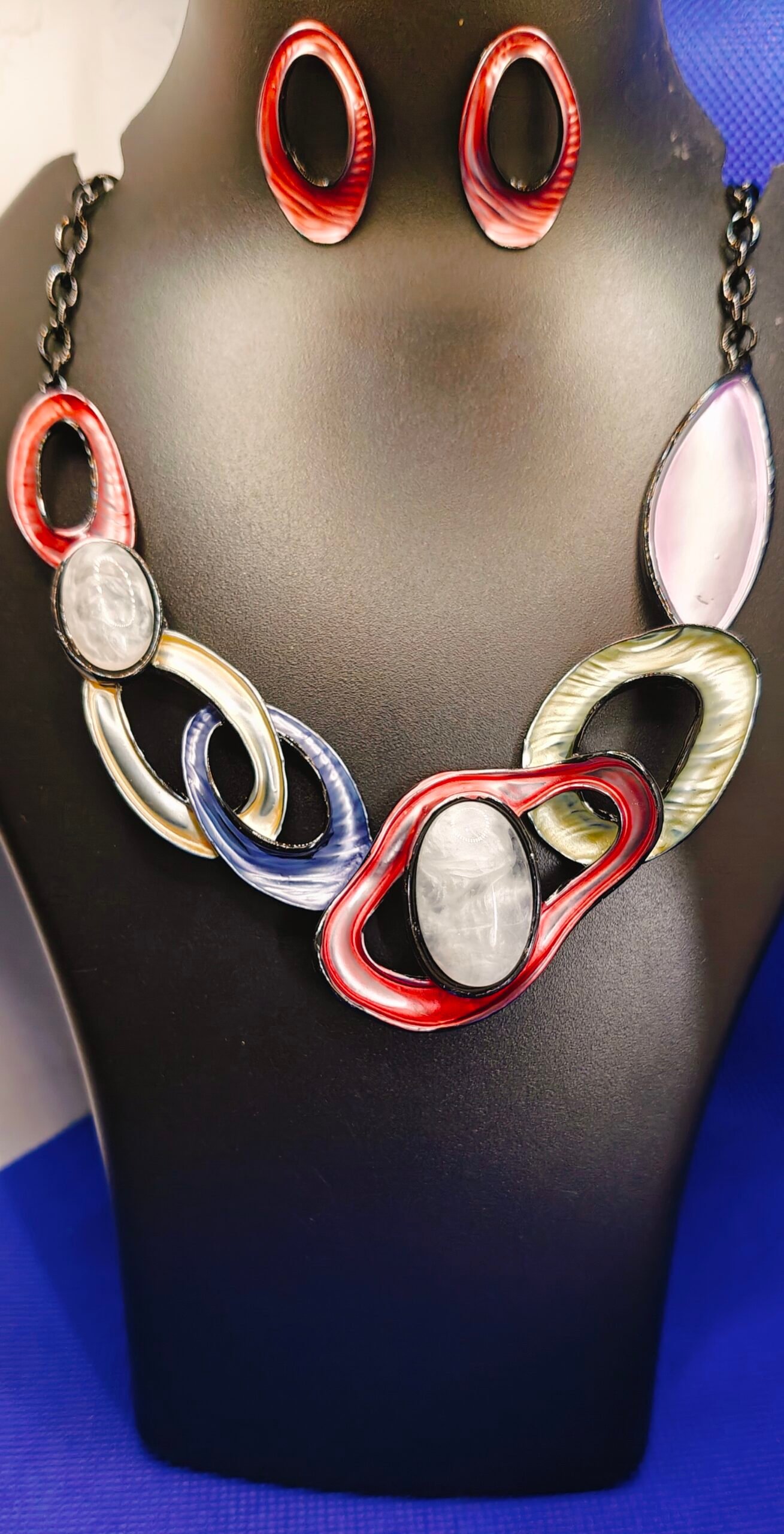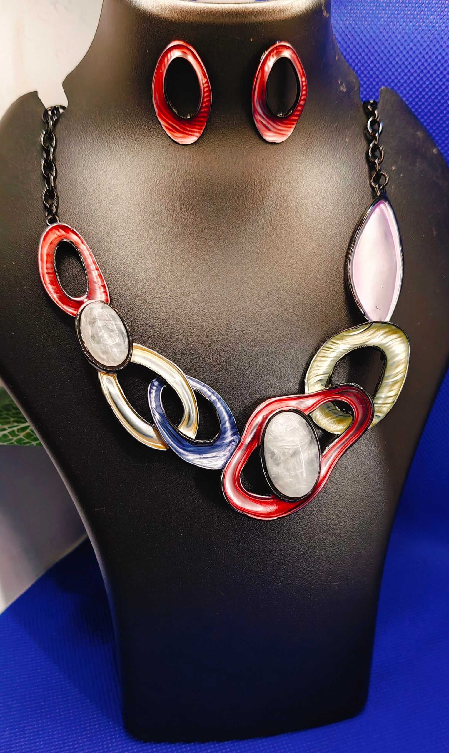 Make a contemporary statement with this eye-catching set! Features an intriguing necklace with various shaped links in vibrant enamel colors and pearlescent accents, perfectly matched with coordinating oval earrings. Ideal for a modern, artistic look