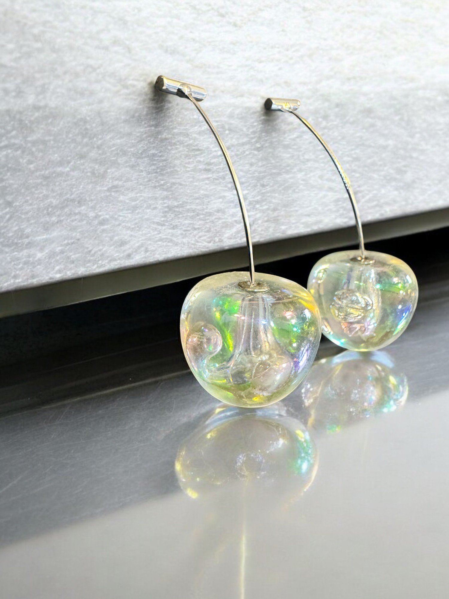 Whimsical Glass Earrings – Crafted with iridescent glass in a unique apple shape, suspended from a silver stem. These earrings add a touch of playful elegance to any outfit