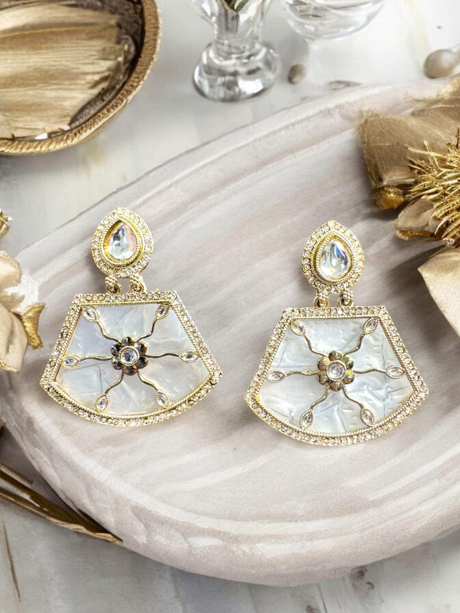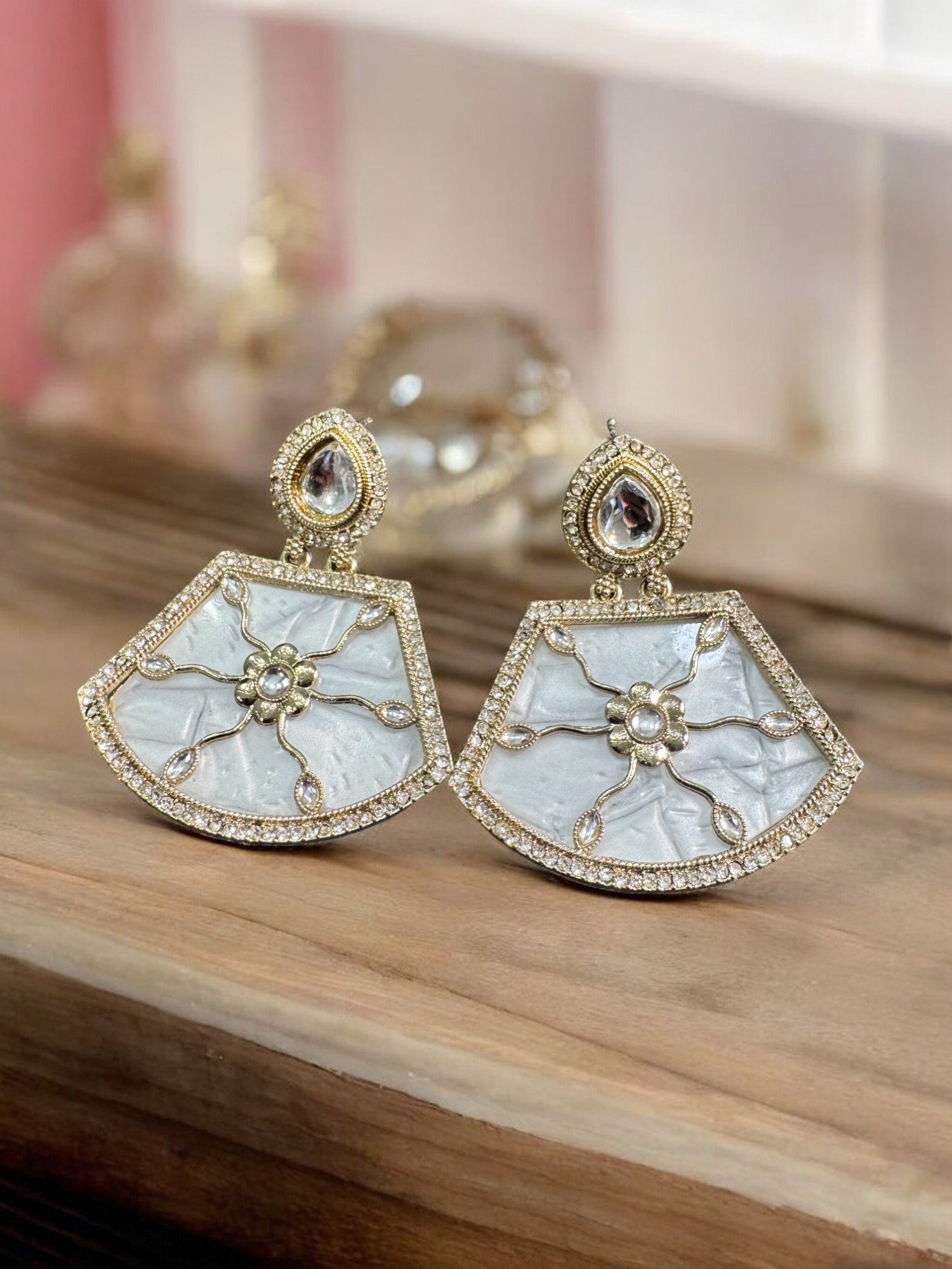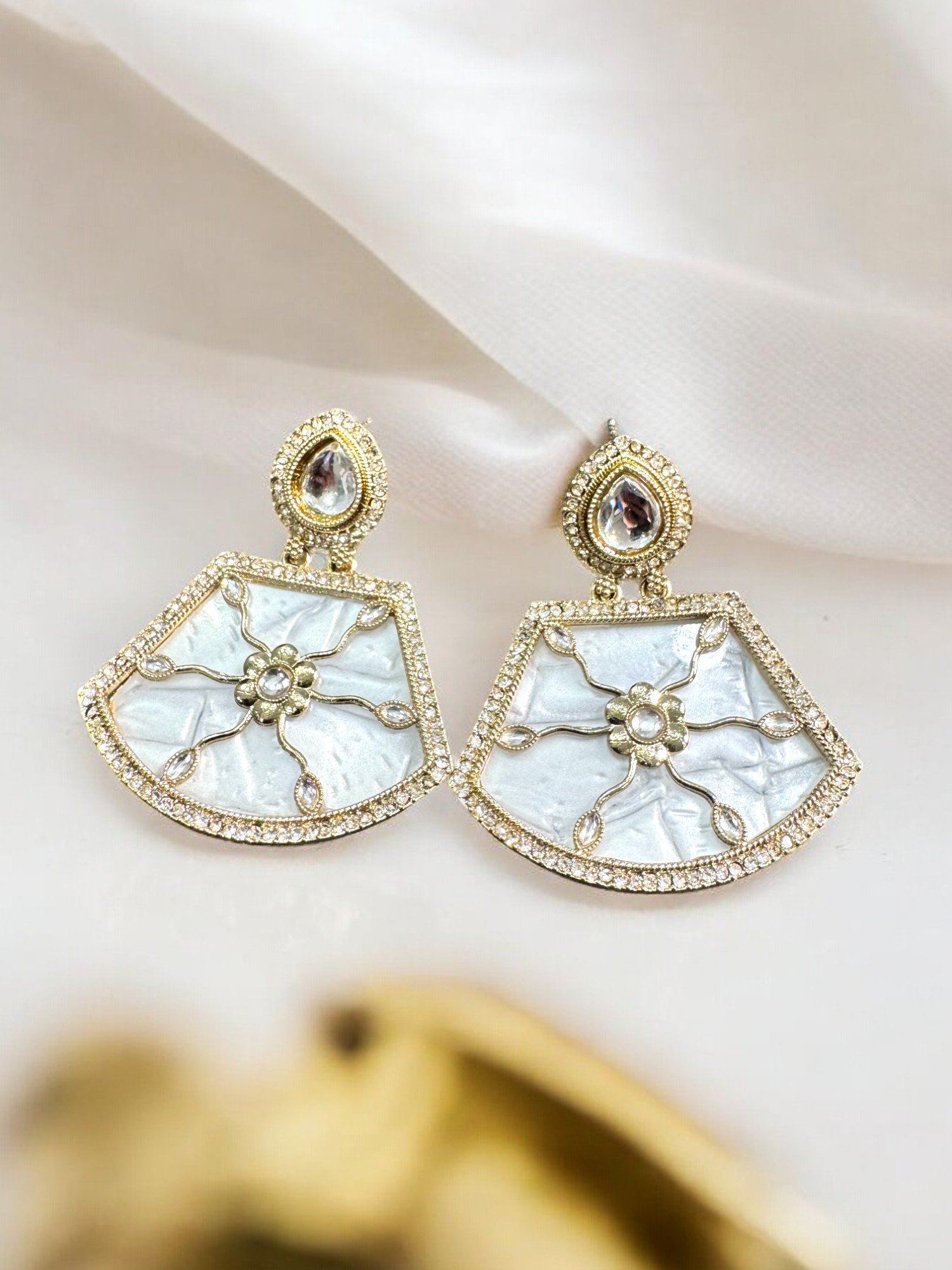 These stunning earrings feature a delicate white design with intricate detailing. Perfect for adding a touch of sophistication to any outfit. The unique fan shape of these earrings makes them a standout piece. The white color and sparkling crystals create a glamorous look. These earrings are crafted with gold-plated metal for a luxurious finish. The intricate design and white color create a timeless piece